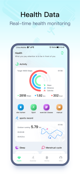 通过智能硬件,不仅能监测跑步、骑行、步行等运动,还包括健身、舞蹈、羽毛球、网球等共14项运动;精心设计的运动心率算法可帮助您监测运动效果;