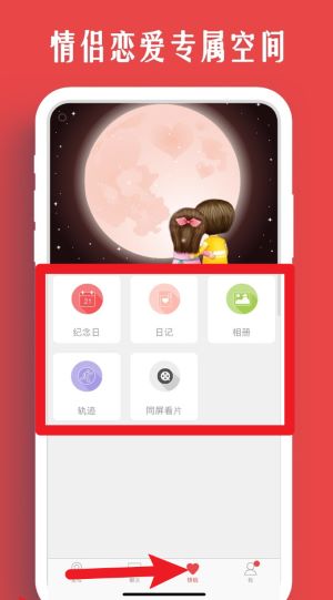 3、点击底部“情侣”栏目,可进入专属空间,记录纪念日、日记、轨迹等情侣互动内容。