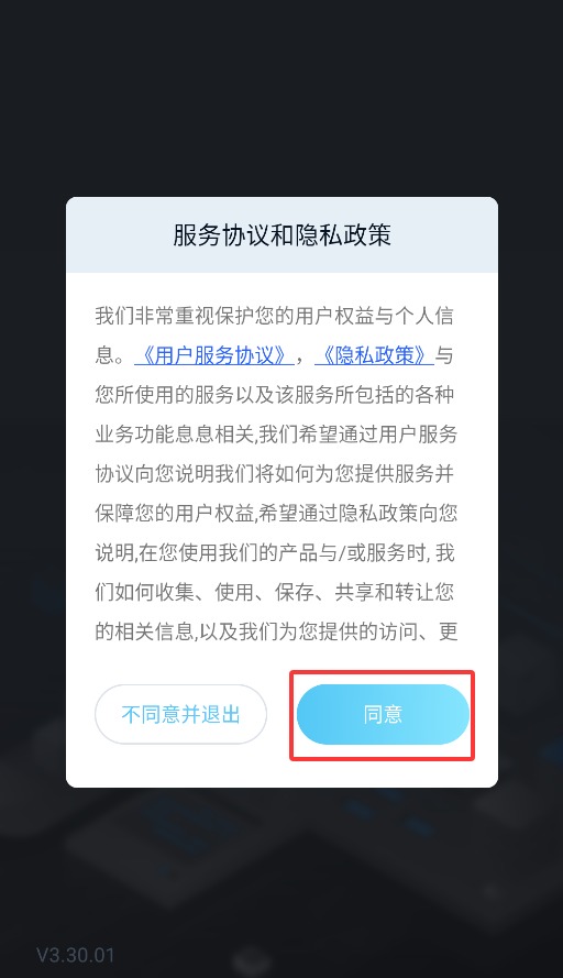 1、首次启动应用时,请点击弹窗中的“同意”选项,方可进入主界面开始使用。